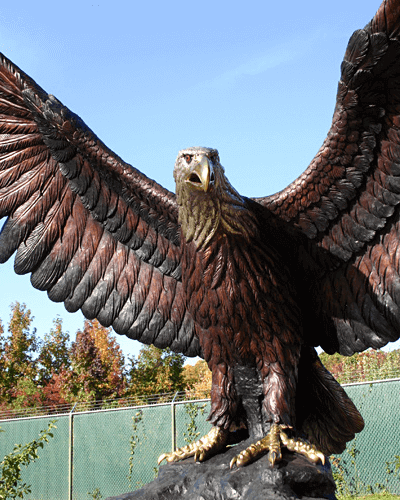 This is an amazing bronze eagle sculpture that will get a lot of attention. The eagle rests on a rock and the wings are spread as if ready to take off. Magnificent craftsmanship, detailed work and a real tribute to this wonderful bird by the artist.