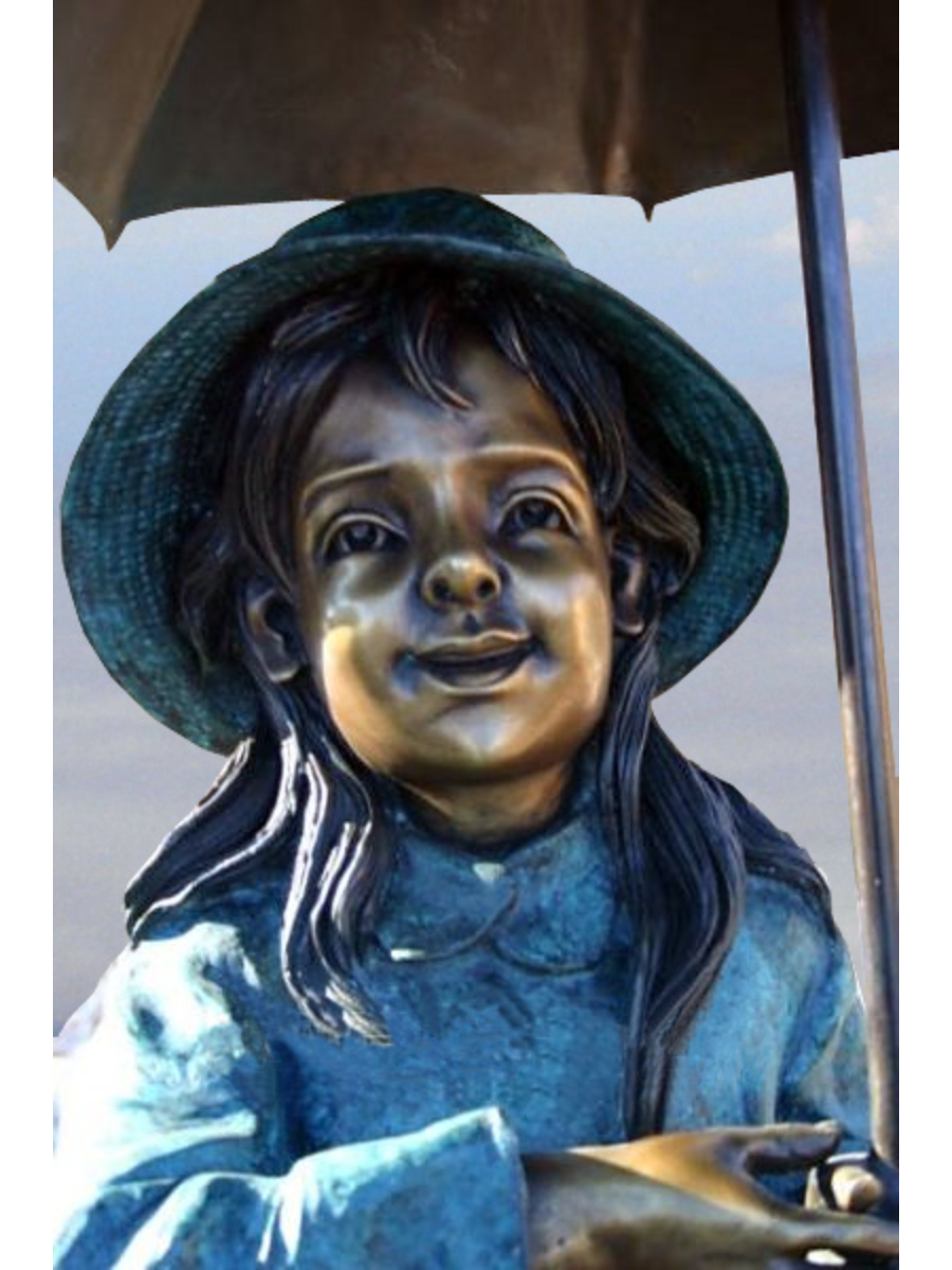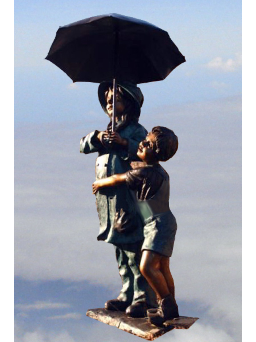 Adorable nostalgic bronze sculpture of a little boy and older girl, both protected from the rani by an umbrella. Wonderful scene of the two children and the affection the little boy shows for his big sister, seeking her protection. This life-size bronze fountain is the perfect sculpture for your garden or outdoor landscaping and fore all an area that is accessible to children.