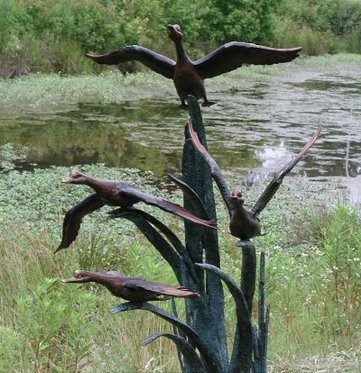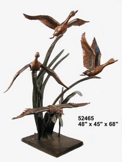 This large bronze fountain cast in the lost-wax method depicts a flock of ducks in flight. This beautiful bird sculpture would look great in a garden pond or as an elegant touch to a natural landscape Available in a special multicolored patina to highlight the natural beauty of this piece