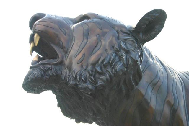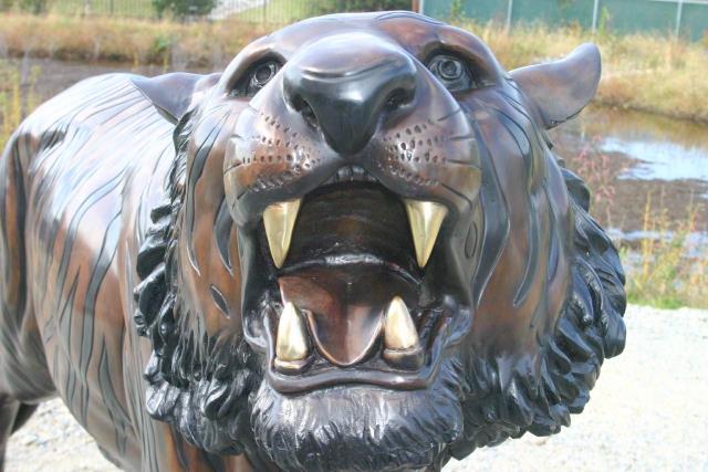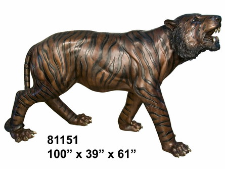 This is our Giant Bengal Tiger sculpture, hand cast in museum-quality bronze using the lost-wax method, and depicted roaring at the sky as he paces his domain. It is the national animal of both India and Bangladesh, and while the most numerous of the tiger subspecies, is still listed on the Endangered Species list as of 2011. Available by special order only, please call 302.738.2190 for availability.