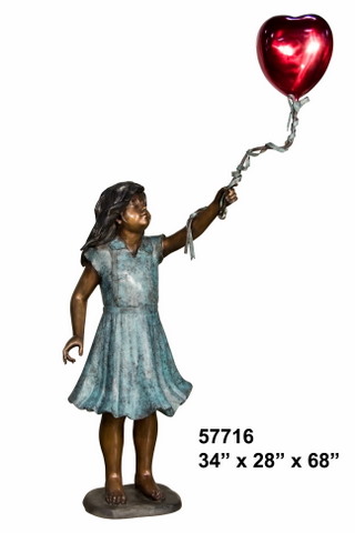 “Girl with a Heart Balloon” sculpture was inspired by a British street artist. Cast by hand in quality bronze with the lost-wax method, this is the perfect accent for park or playground area, children’s hospitals, daycare, indoors or outdoors. Hand-painted with a beautiful tri-color patina finish for added realism and contrast.