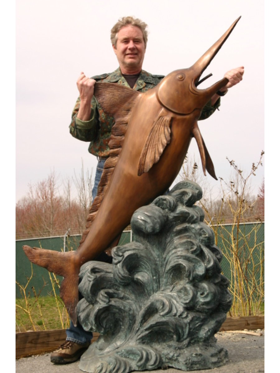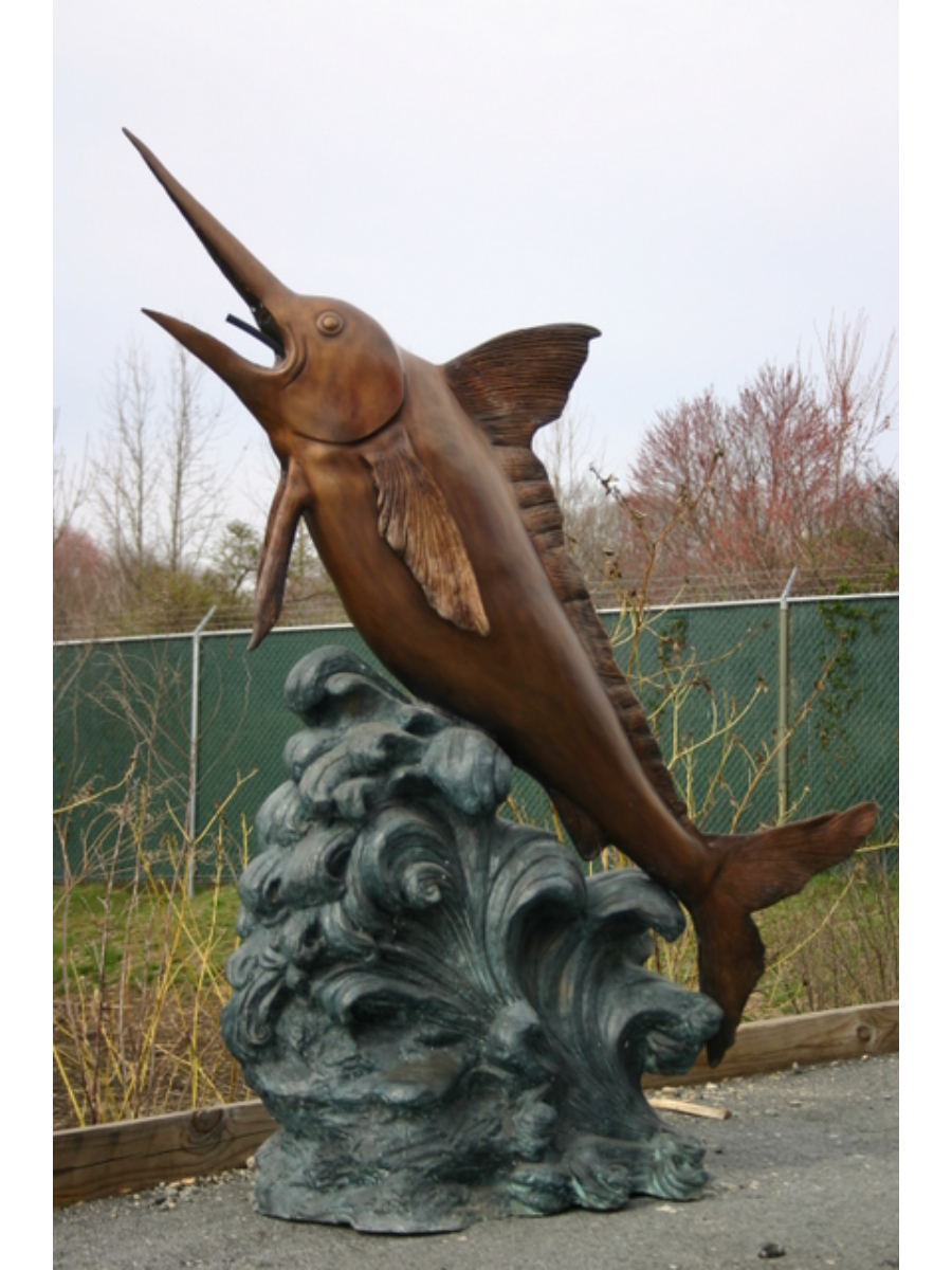 This bronze fountain shows a lifesize marlin leaping over a spray of water. This sculpture is a beautiful accent for any garden, pond or pool environment.