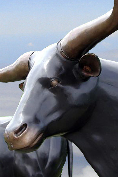 This amazing life-sized Texas Longhorn bronze statue is an ode to a breed of cattle that was the first one to enter North America and that has the ability to thrive without human care in even barren conditions. The Texas Longhorn cattle today represents the romance of the Old West and are often retained for their beauty and intelligence, and is an official symbol for the city of Fort Worth, Texas.