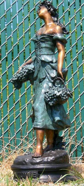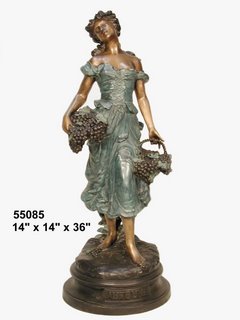 A beautiful, museum quality bronze sculpture of a Tuscan woman holding a grape basket on the way back from the vineyard. This classically styled piece would look great in almost any setting. It goes well in a home or corporate setting and makes a great addition to any collection. This elegant sculpture is sure to be a great conversation piece that visitors will rave about.